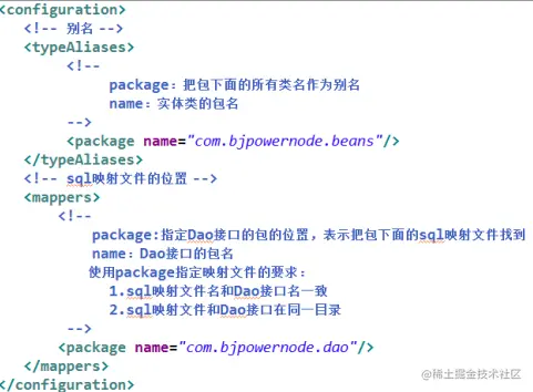 ● 这里对 mapper 映射文件的注册,使用标签,即只需给出 mapper 映射文件所在的包即可。因为 mapper 的名称与 Dao 接口名相同,可以使用这种简单注册方式。这种方式的好处是,若有多个映射文件,这里的配置也是不用改变的。当然,也可使用原来的 标签方式。