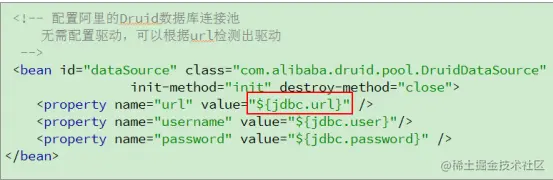 Spring 配置文件从属性文件中读取数据时,需要在的 value 属性中使用${ },将在属性文件中定义的 key 括起来,以引用指定属性的值。