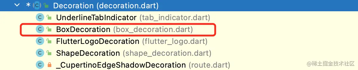 Flutter 框架中提供了四个实现类,其中 BoxDecoration 是我们最常用的。