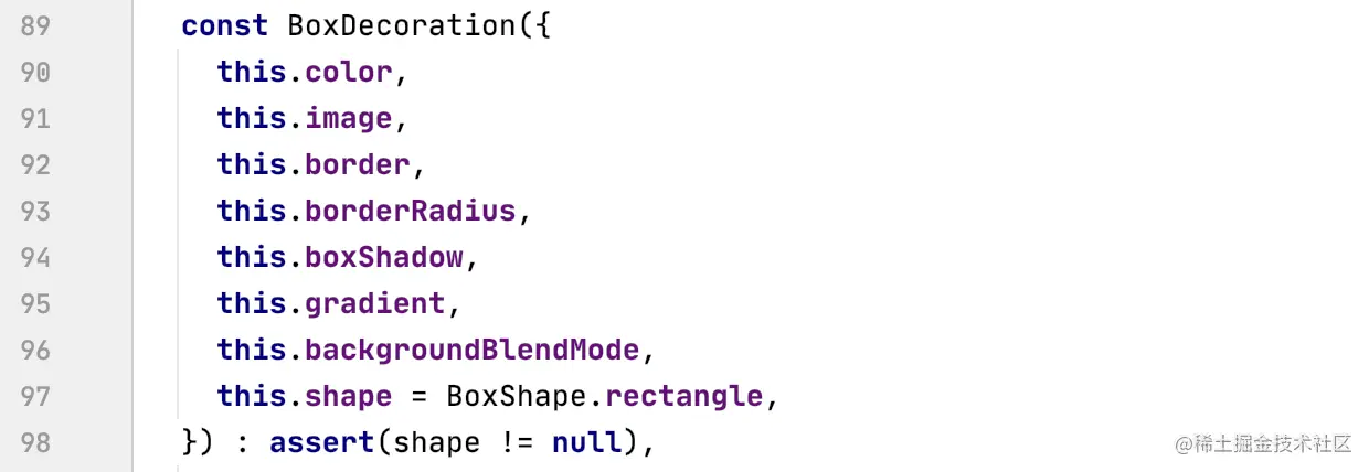 下面是 BoxDecoration 的构造方法,可以看出除了圆角和颜色,还有很多入参,比如背景图片、边线、阴影、渐变、形状等。