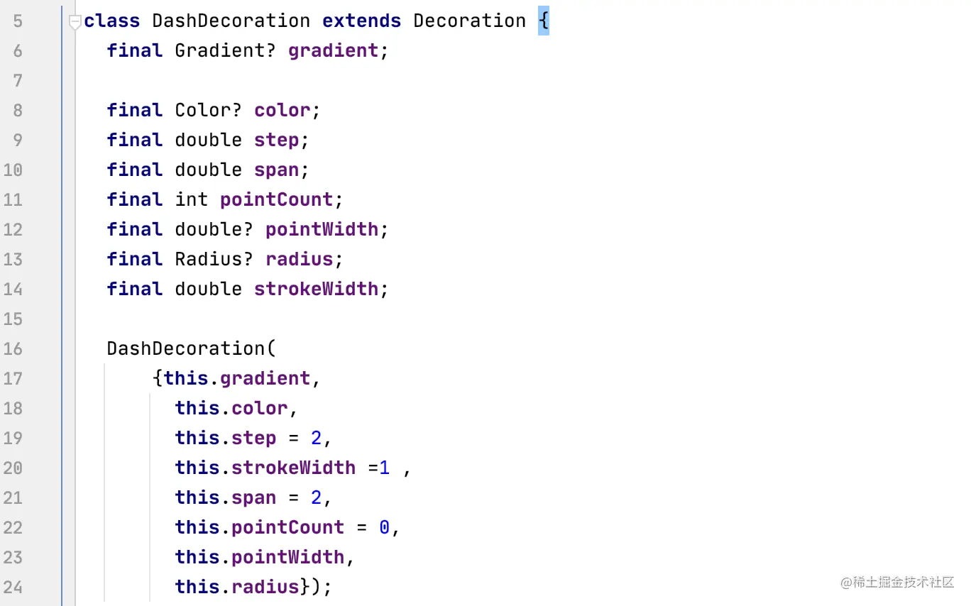 下面看一下 DashDecoration 的源码实现,首先定义可配置的参数,通过构造函数初始化。