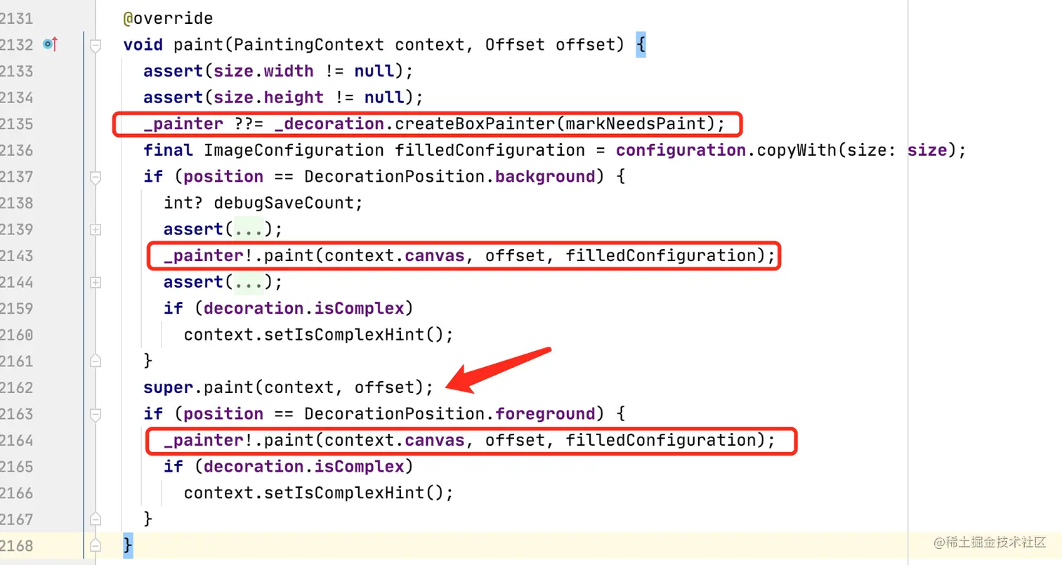 核心代码是下面的 paint 方法,执行绘制。其中 super.paint(context, offset); 是绘制子组件,可见 background 是在绘制孩子前绘制,也就是作为背景,孩子在前面。而 foreground 会覆盖在孩子前面,也就是前景。画笔是通过 _decoration#createBoxPainter 创建的,也就是那个 BoxPainter 对象。