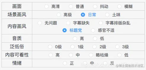 之前做审核平台的时候遇到这样一个场景:复审的时候动态返回一些类别,并且每个类别下有多个单选项,需要将 一审的结果回显,效果如下图,数据都是接口返回的: