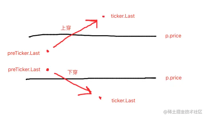 preTicker.Last < p.price && ticker.Last > p.price - 下穿网格线条件: