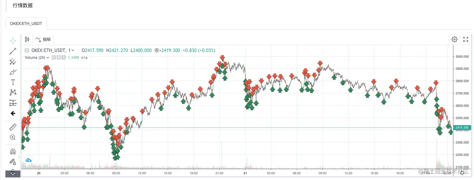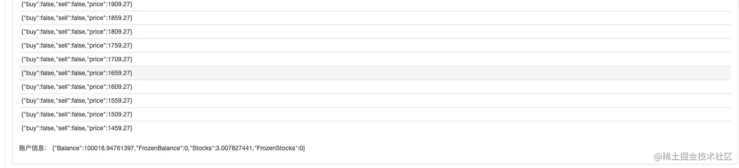上穿下穿只是判断可否下单交易的第一步,其中还需要判断网格线数据中的标记。如果是上穿,就判断价格低于当前网格线并且最近的网格线上的buy标记,如果buy标记的值为true,则说明上一根网格线买入过,就重置上一根的buy标记为false,重置当前网格线sell标记为false。判断完刚才的条件,如果没有触发则继续判断,如果当前网格线上buy/sell标记均为false,则说明当前网格线可以交易,由于是上穿,我们这里执行卖出操作,执行之后标记当前网格线sell标记true。下穿处理逻辑相同(这里留给萌新们思考思考)。
