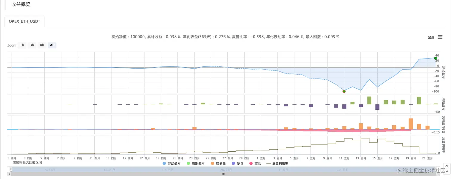 可以看到网格策略的特点,遇到有趋势行情的时候会有较大浮亏,震荡行情下收益才会回升。所以网格策略并非无风险,现货策略尚可“躺平”硬撑,期货合约网格策略则风险更大,需要对于网格参数偏保守设置。