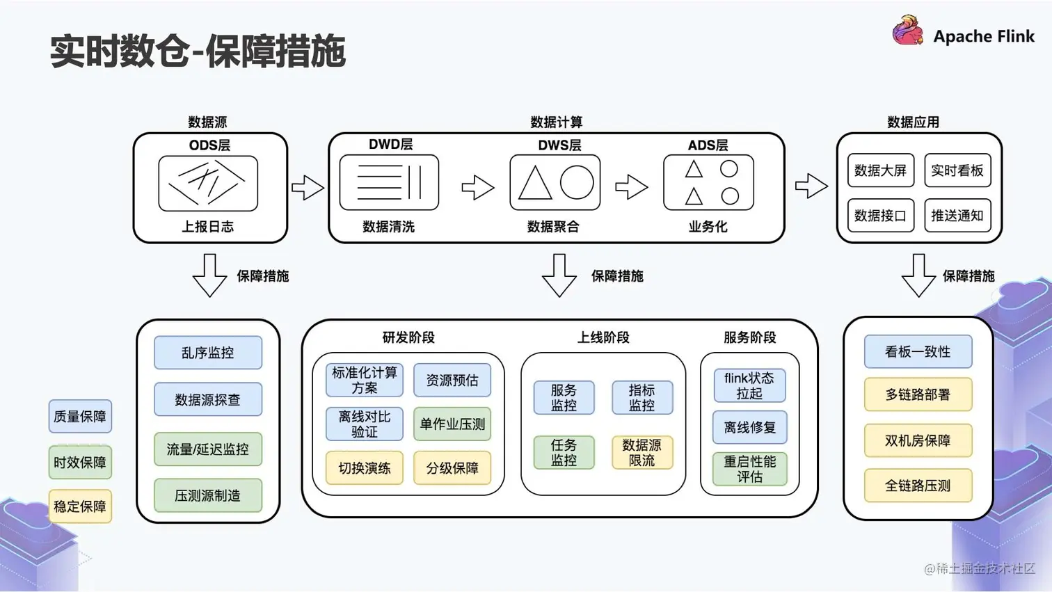 - 我们先看蓝色部分的质量保障。针对质量保障,可以看到在数据源阶段,做了如数据源的乱序监控,这是我们基于自己的 SDK 的采集做的,以及数据源和离线的一致性校准。研发阶段的计算过程有三个阶段,分别是研发阶段、上线阶段和服务阶段。研发阶段可能会提供一个标准化的模型,基于这个模型会有一些 Benchmark,并且做离线的比对验证,保证质量是一致的;上线阶段更多的是服务监控和指标监控;在服务阶段,如果出现一些异常情况,先做 Flink 状态拉起,如果出现了一些不符合预期的场景,我们会做离线的整体数据修复。