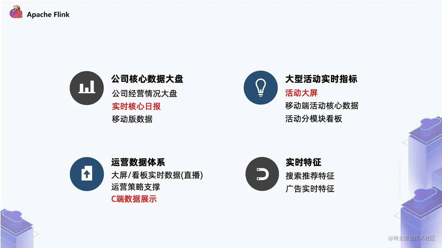 - **运营部分的数据:**运营数据主要包括两方面,一个是创作者,另一个是内容。对于创作者和内容,在运营侧,比如上线一个大 V 的活动,我们想看到一些信息如直播间的实时现状,以及直播间对于大盘的牵引情况。基于这个场景,我们会做各种实时大屏的多维数据,以及大盘的一些数据。此外,这块还包括运营策略的支撑,比如我们可能会实时发掘一些热点内容和热点创作者,以及目前的一些热点情况。我们基于这些热点情况输出策略,这个也是我们需要提供的一些支撑能力;最后还包括 C 端数据展示,比如现在快手里有创作者中心和主播中心,这里会有一些如主播关播的关播页,关播页的实时数据有一部分也是我们做的。