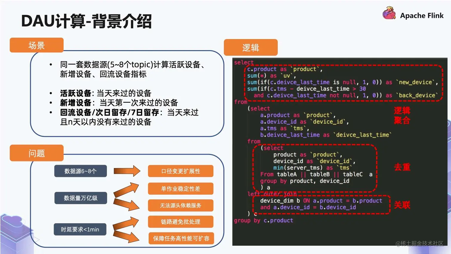 得到这个信息之后,我们就可以进行逻辑计算,然后我们会发现新增和回流的设备其实是活跃设备里打的一个子标签。新增设备就是做了一个逻辑处理,回流设备是做了 30 天的逻辑处理,基于这样的解决方案,我们能否简单地写一个 SQL 去解决这个问题?