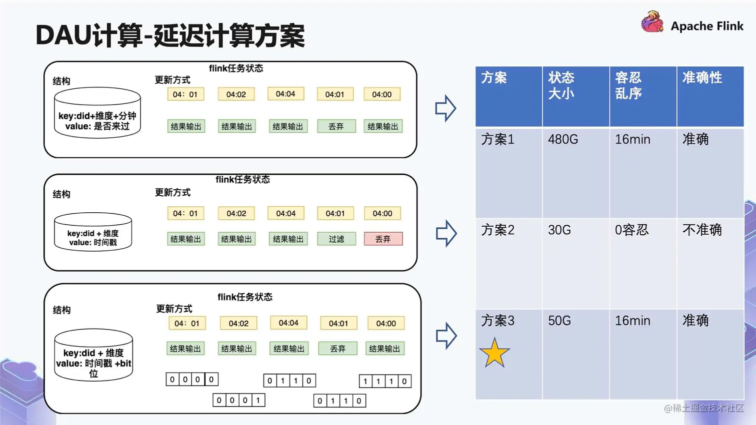 - 第一种解决方案是用 “did + 维度 + 分钟” 进行去重,Value 设为 “是否来过”。比如同一个 did,04:01 来了一条,它会进行结果输出。同样的,04:02 和 04:04 也会进行结果输出。但如果 04:01 再来,它就会丢弃,但如果 04:00 来,依旧会进行结果输出。