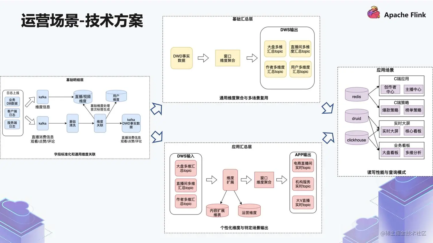 - 如图中下方,基于这些通用维度数据,我们再去加工个性化维度的数据,也就是 ADS 层。拿到了这些数据之后会有维度扩展,包括内容扩展和运营维度的拓展,然后再去做聚合,比如会有电商实时 topic,机构服务实时 topic 和大 V 直播实时 topic。
