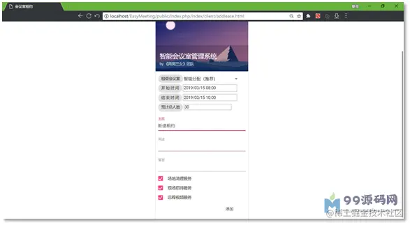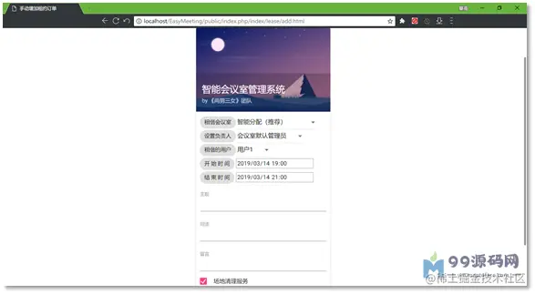 会议主题、具体用途会显示在租约列表中,而留言一项则只有对应的会议室负责人和主管理员账号才能看到。表单最后的三项服务:场地清理服务、现场招待服务、远程会议服务,则为本系统提供了与外公司合作的扩展接口,可以大幅度减少后期添加功能的成本,增强本系统的可扩展性。