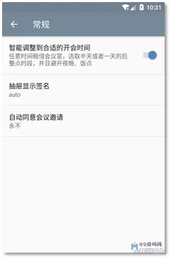 每一个APP都有自己的应用设置,EasyMeeting提供了简单移动的原生设置界面。设置分为三类,分别是常规、通知、数据与同步。常规中有一些常用的选项,比如租借会议室时是否智能调整时间、显示的信息、自动同意会议邀请等。在“通知”选项中,确认开启会议前一小时通知,避免错过会议时间。而在“数据与同步”中,可以设置用户数据与租约的同步间隔,避免在其他设备上做了修改而导致本设备数据过期。