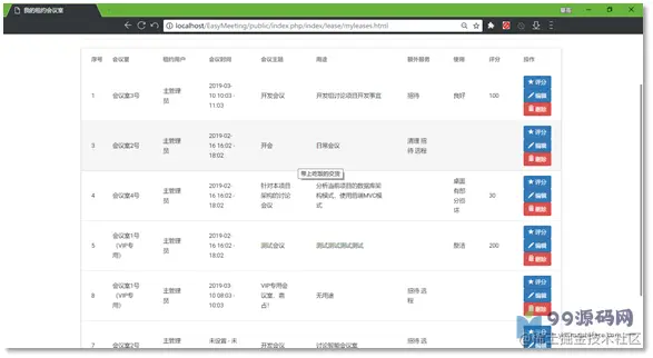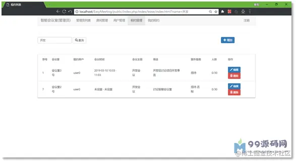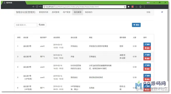 管理员账号登录后,从菜单中点进去,可以看到所有的会议室租约信息,用户ID、会议室ID等数据库主键字段则转化为相应的名字,如图3.3.2.8所示。