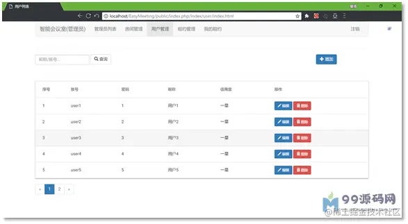 使用管理员账号登录可以看到用户的账号信息,包括用户名、昵称、信用度、租借的会议室等。图3.3.2.5为在管理员视图下的用户账号列表。