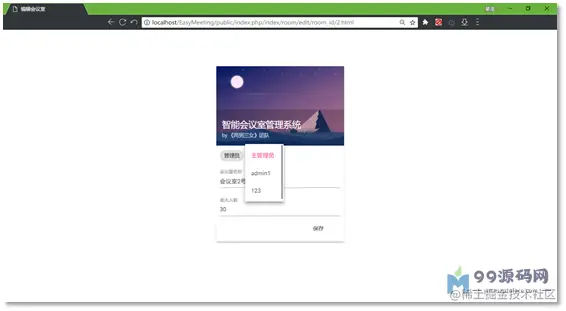 每一个会议室都有自己对应的管理员,即负责人,可以使用相应权限的管理员账号修改相关信息。在会议室编辑界面中,列出所有的管理员账号供选择,如图3.3.2.4。能够自定义会议室名字用以分辨,而不是简单的门牌号。还可以设置最大人数,供在智能选择会议室的时候选择人数最恰当的会议室,用来腾出更多人数较多的会议室供其他用户使用。