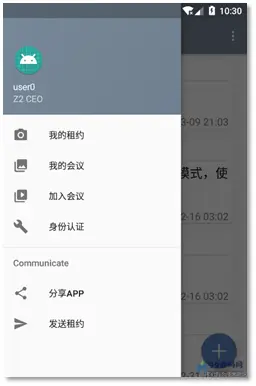 侧滑菜单中有四个界面,分别为:租约列表、我的会议、加入会议、身份认证。默认界面是租约列表,在侧滑菜单中任意切换“所有租约”和“我的会议”。