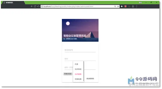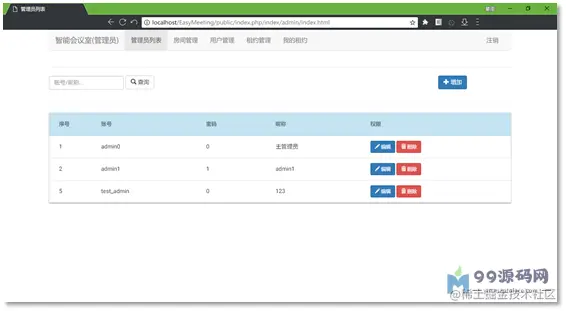 添加账号,只需要提供管理员账号、昵称,即可快速加入到所在管理员中。每个管理员都需要设置不同的权限,分别为:只读、允许修改、允许删除、完整权限。只读管理员账号可查看所有会议室、管理员账号、用户账号信息,只有拥有完整权限的主管理员账号才能修改其他管理员账号。 同样的,在管理员账号管理界面,可以编辑管理员信息、删除管理员账号等。由于使用ThinkPHP5的MVC模式架构,后期可快速扩展管理员的手机号、邮箱等实名信息。