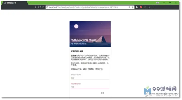 作为负责人,除了需要到现场控制会议的租借流程,还需要在事后针对会议环境情况进行打分、评级。每一条租约默认为100分,会议室负责人在盘查场地情况后,给予本次租借的用户一定分数,此分数会纳入用户的信用度。信用度越高,在会议室资源紧张时接到会议室的几率就越大。同时,如果用户租借的会议室房间出现大幅度的损坏,或者出现会议拖延到很晚的情况,那么管理员可针对该用户进行一定的负评分,当评分低于0时,用户账号将处于冻结状态,无法再进行租约,直到管理员手动修改用户信用度。下图为租约评分。