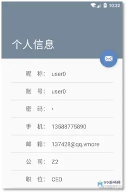 在侧滑菜单中,包括了显示用户资料,包括昵称、职位等,可以在策划菜单中点击头像,进入用户信息界面,如图所示。