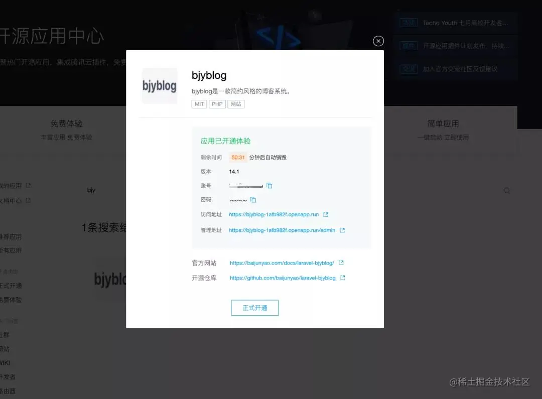 第二步:点击免费体验或正式开通,开通完成。下图的账号和密码就是你的管理员账号和密码