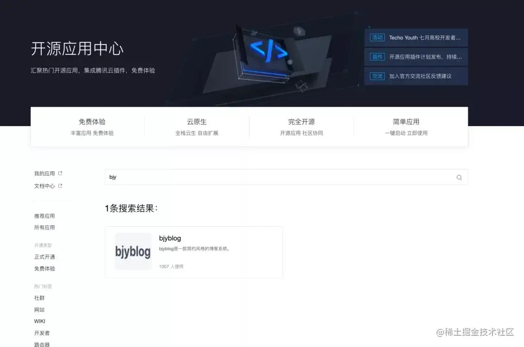 第一步:点击链接直达;或登录腾讯云开源应用中心,搜索biyblog应用