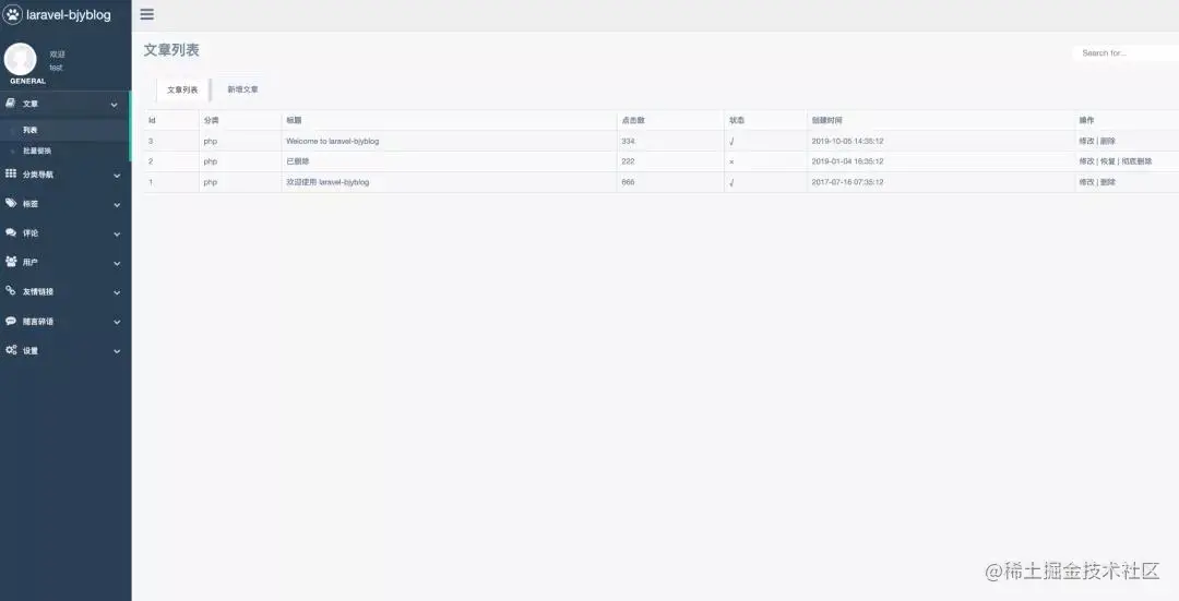 登陆后台,点击文章→列表,可以看到我们发布的文章,并且可以对这些文章进行修改与删除