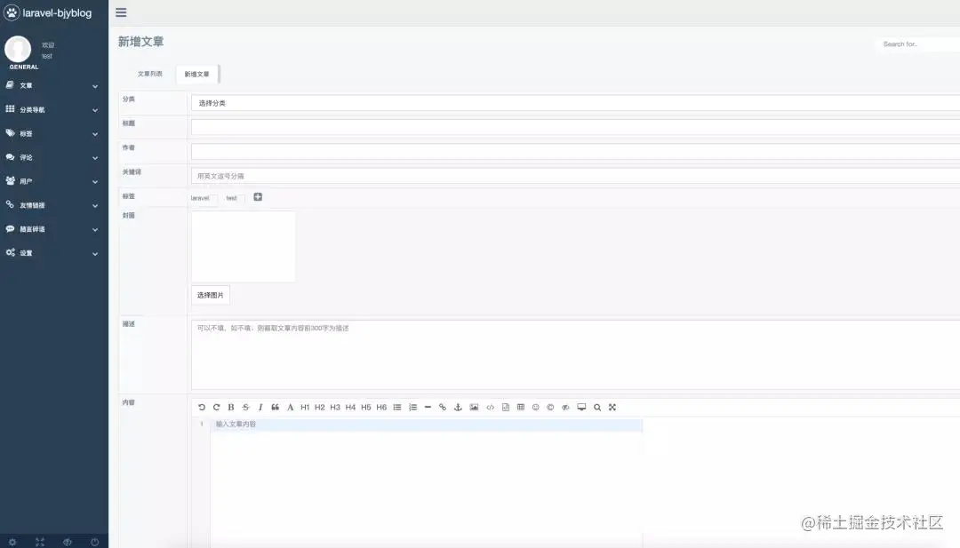 点击新增文章按钮,会跳转到文章编写的界面,在新增文章的时候,可以为文章添加分类、标签等属性,方便管理