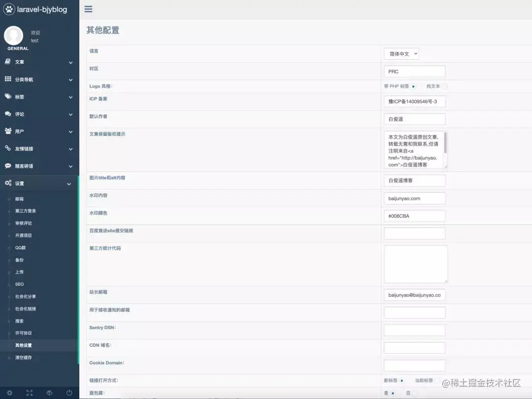 在其他设置中,可以设置站长邮箱、默认作者、水印等功能
