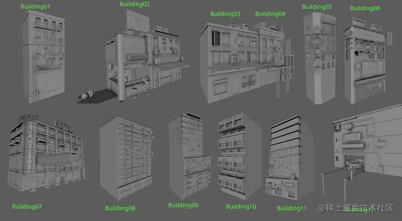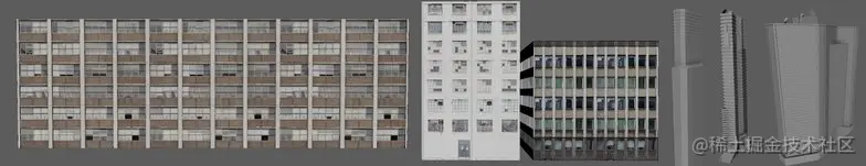 就细节而言,主建筑物之外的其余的建筑要宽松得多。它们是如此遥远,以至于我不必在它们身上花费更多的时间去完善。我分散了一些预制资产,使它们看起来不会过于重复。一些建筑物是基于图像纹理完成的。我在其上绘制建筑物的纹理,然后开始拆分和拉伸以制作细节。
