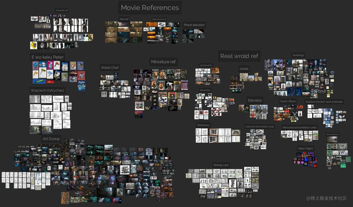 因为这个项目需要制作的东西很多,所以我使用Pure Ref创建了一个巨大的参考板。我将参考分为几类,例如电影参考资料,现实生活中的建筑物,现实生活中的道具,在网上找到的鼓舞人心的艺术品等。对于需要建模,纹理化或照明的每个部分,我都设置了一个单独的参考图像类别。这可以节省工作时间,当在实际的制作中时,我能够立即找到所需的内容。