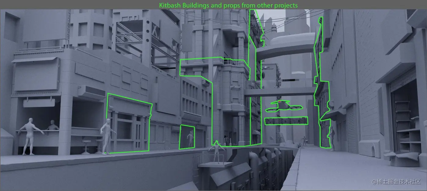 一旦我完成了所有主要的建筑模型,那么就可以花些时间到重要的地方上了。基于摄像机的视点镜头(POV),我会先挑选一部分的建筑物,然后真正带着细节搭建城市。我通常会尝试先平衡构图,以便拥有足够的细节和介于两者之间的休息区域。然后再对每座建筑物进行详细设计,这非常耗时,但这也是可以将一般和出色的模型区分开来。