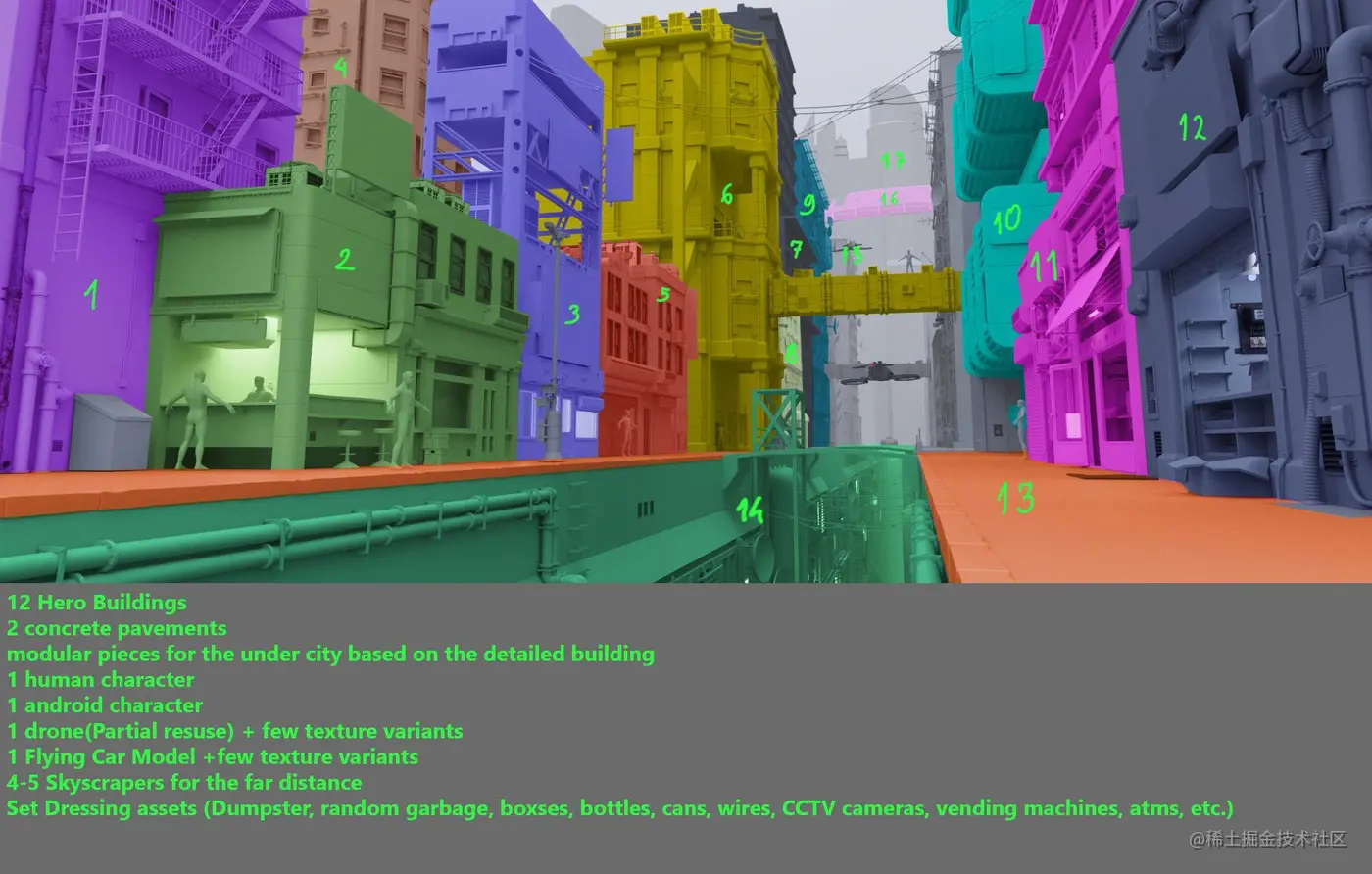 由于这个场景非常的庞大,所以它的基础模型和blockout 的结构都使用了将近2个月的时间完成。我制作blockout 是因为,在确认我想要制作什么之后,小说中故事情节的建筑物得到了很大的改进。这就是为什么我喜欢将此阶段称为Blocking Plus。场景变得越来越复杂,所以我决定将建筑物拆分为一些单独场景,以便可以轻松地对每个场景进行单独处理。