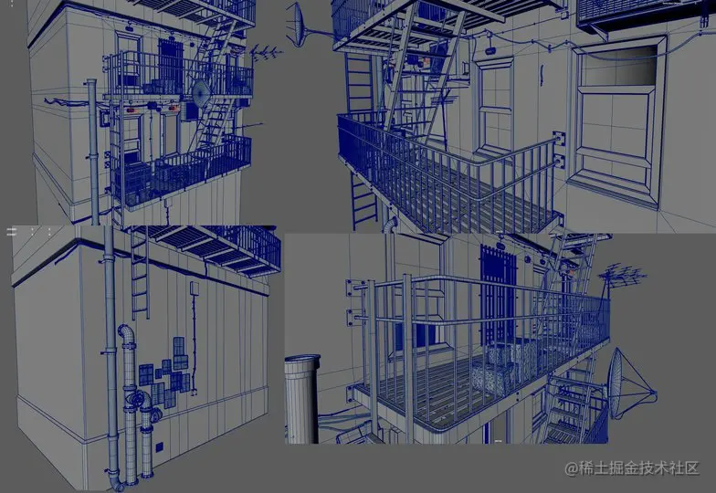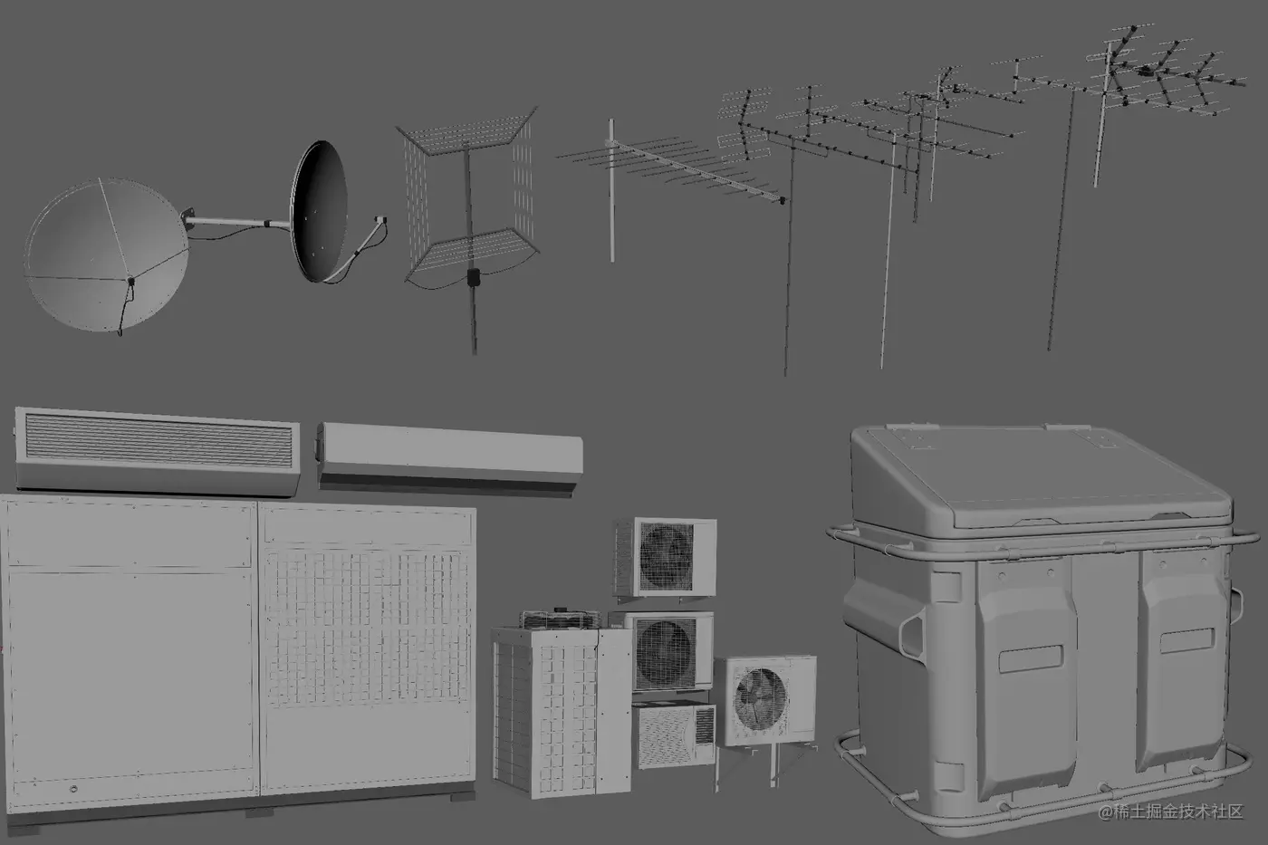 将建筑物拆分为单独的文件后,我稍微地停止了一下项目的制作,以便思考该如何继续。随后我再次开始创建那些可以重复使用在建筑物上的通用资产。这些资产包括许多不同类型的空调、天线、管道、围栏等。