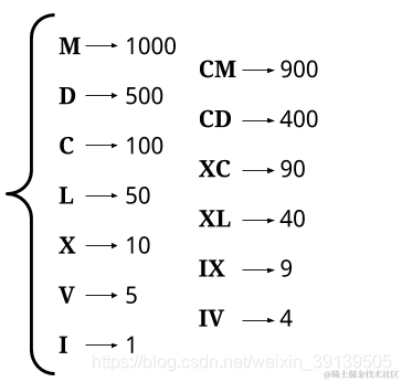 思路:贪心即可,罗马数字由 7 个单字母符号组成,同时加上减法规则给出了额外的 6 个符号。总共 13 个独特的符号。如下图,每个(组)符号代表不同的数字(图片来自官方题解),这样我们就可以从大到小开始贪心,保证前面的字符时符合要求的最大的代表符号即可。比如510,我们是先写D而不是写五个C。