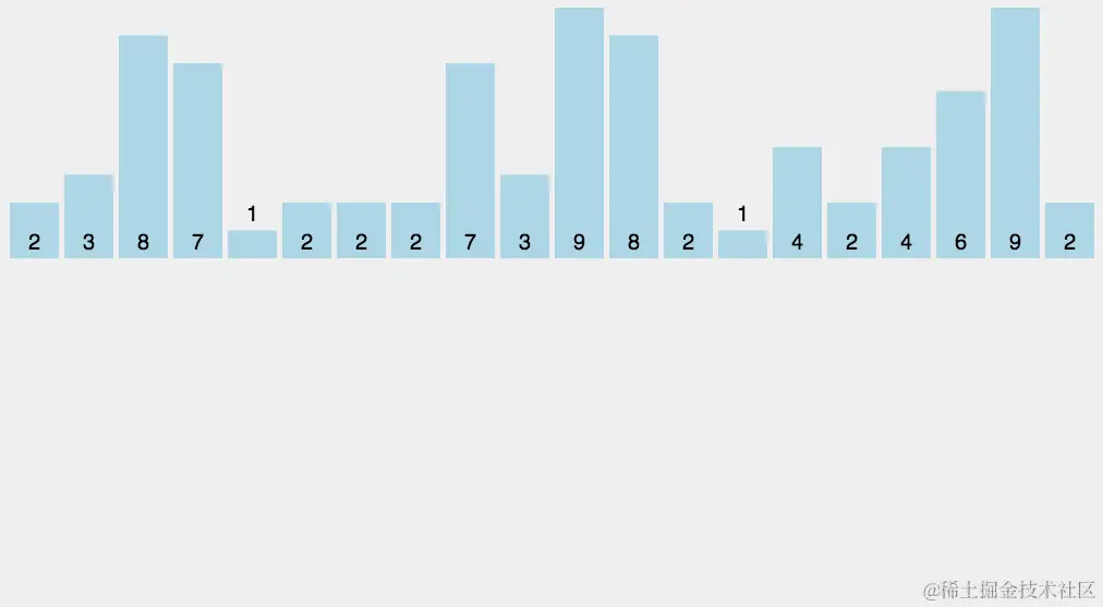 原理就如算法名字一样,就像水中的气泡一样,每次我都把最大的或最小的放到最后面,这样总共需要n-1趟即可完成排序,这就是第一层循环,第二次循环就是遍历未被固定的那些数(理解成数组左边的数,因为每层循环都会把最大或最小的数升到最右边固定起来,下次就不遍历这些数了),两层循环遍历结束后,所有的数就排好序了。