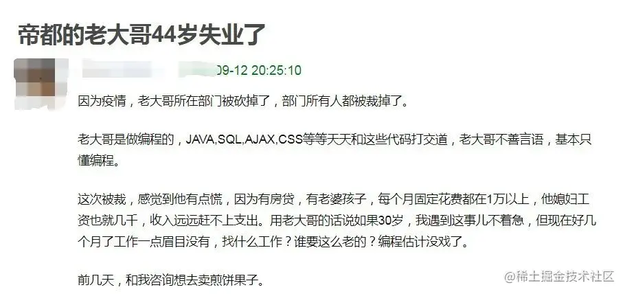 程序员35岁中年危机,似乎是一个跨不过去的坎,最近,在职场论坛上看到了一位帝都44岁大龄程序员被裁的帖子,有些低落。