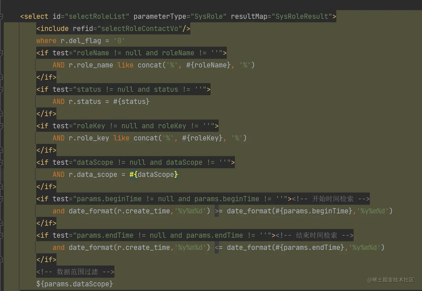 对dataScope参数的一个拼接,并且进行了类型的转换,继续跟传播链,RuoYi/ruoyi-system/src/main/java/com/ruoyi/system/mapper/SysRoleMapper.java