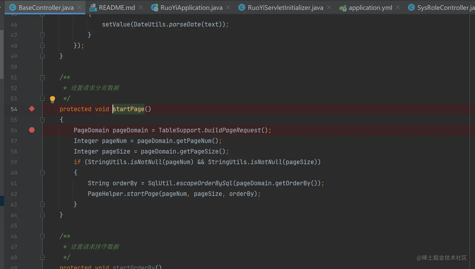 查看代码可以确定利用的漏洞路径为/system/role/list,以POST的方式进行传参,可以看到初始的污点源为传递给TableDataInfo的参数role,跟进方法中调用的startPage()方法