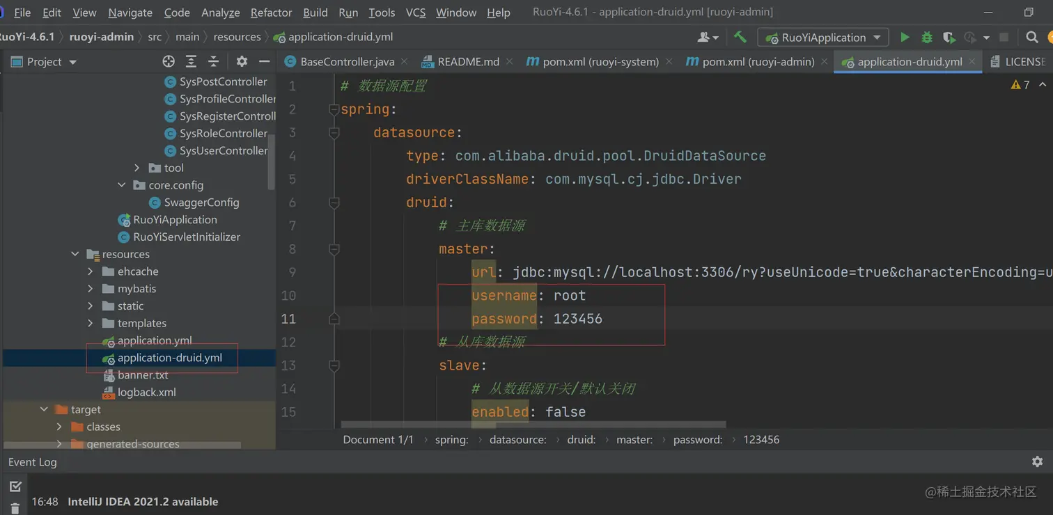 Github找一下若依4.6.1版本下载到本地,丢到IDEA里面,数据库文件导入,druid连接池配置文件中修改username和password