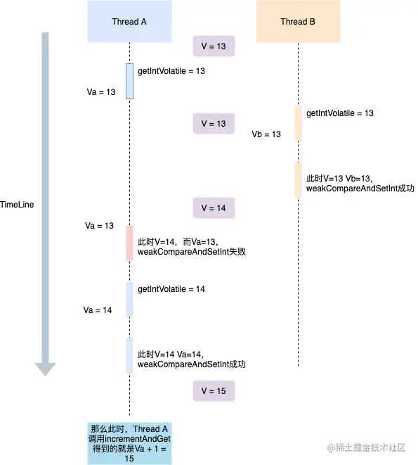 所以在并发的场景下,incrementAndGet这种API,得到的并不一定是调用处的V+1,可能是更大的值。