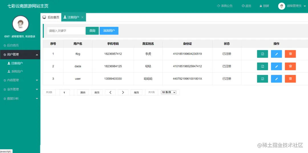 注册用户 查看前台网站的注册用户信息,可以对其进行搜索查询,同时也可以进行添加,删除等操作。