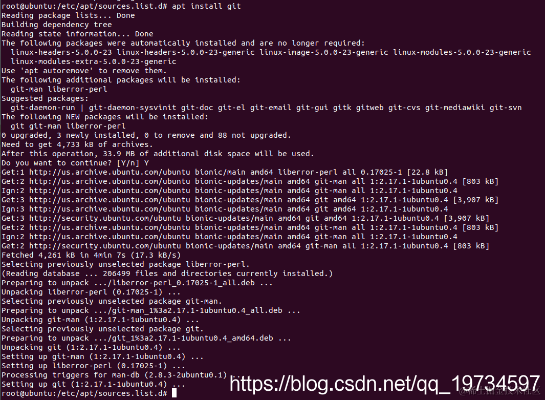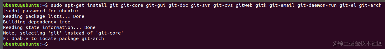 系统更新完成,再次执行 sudo apt install git,图示如下: