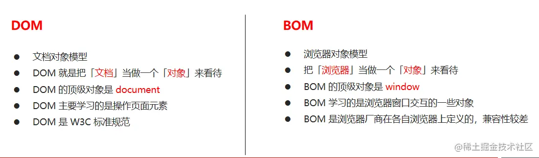 BOM 缺乏标准,JavaScript 语法的标准化组织是 ECMA,DOM 的标准化组织是 W3C,BOM 最初是Netscape 浏览器标准的一部分。