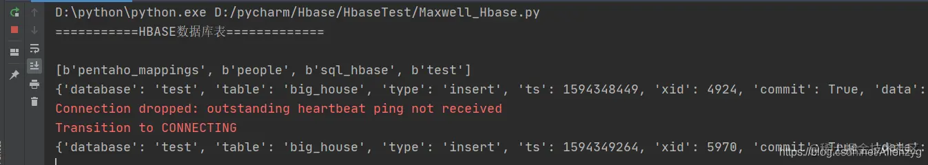代码运行界面:这里由于不稳定造成了心跳检测超时,重新连接了。不影响结果。