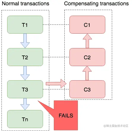 可以看到,T1、T2、T3 一直到 Tn 分别代表分布式事务中的分支事务,这条线都是事务的正常状态,如果在执行的过程中,有某一个抛出异常,则执行 C3、C2 一直到 C1 进行事务的回滚,这里的回滚实际上就是反向补偿操作。