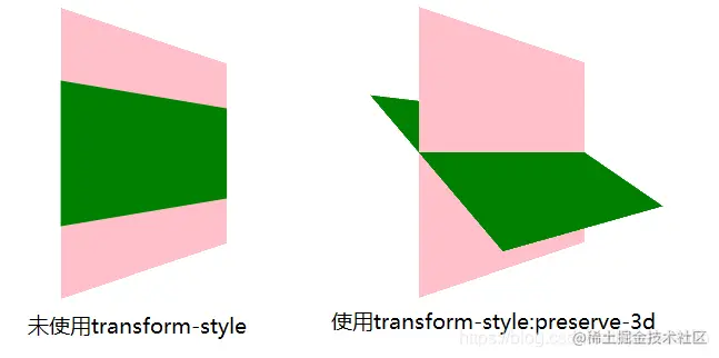 上面代码中一个大盒子中嵌套两个小盒子,当我们鼠标悬浮到大盒子上时,我们先让绿色小盒子沿着X轴正向旋转60度,然后再让大盒子沿着Y轴正向旋转45度 。那么在我们不用transform-style修饰时会得到如下第一个图的效果,而使用了transform-style后会出现第二张图的样子。这个例子很好的描述了transform-style的作用(保留子元素的3D效果)。