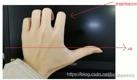 - 其余手指的弯曲方向就是该元素沿着x轴、y轴、z轴旋转的方向