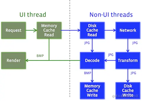 从网络或者本地加载。加载完成后,解码,变换,返回。存到各个缓存中。